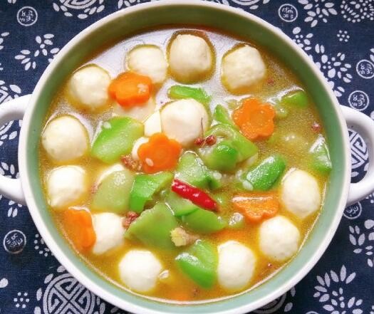 食材:丝瓜、鱼丸、胡萝卜、姜蒜、干辣椒、花椒、盐、鸡粉