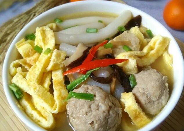 食材:鸡蛋、年糕、肉丸、干香菇、木耳、冻豆腐、黄花菜、葱、盐、生抽、鸡粉