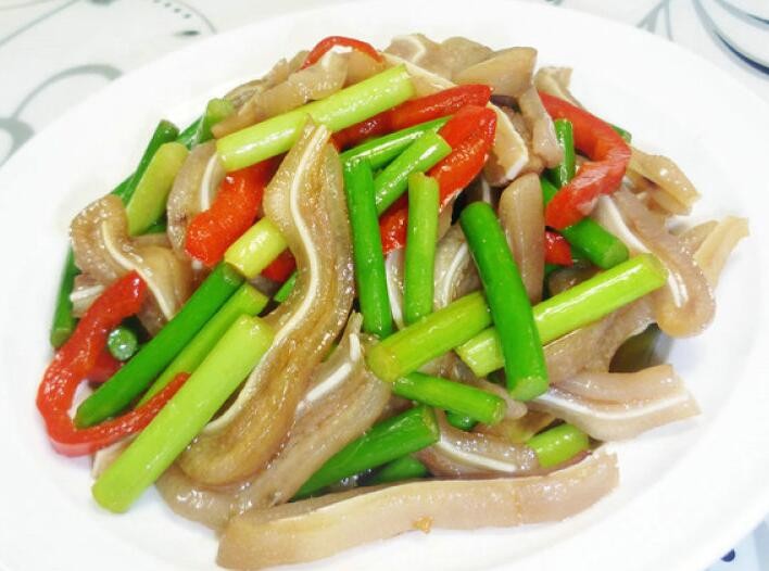 食材:猪耳朵、红椒、蒜苔、盐、生抽、鸡粉