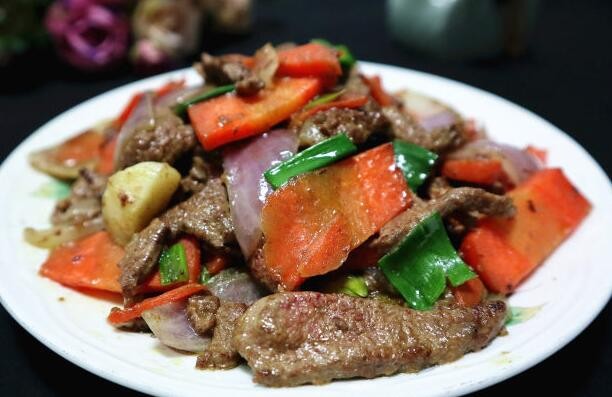 食材:猪肝、胡萝卜、葱姜蒜、洋葱、盐、生抽、料酒、淀粉