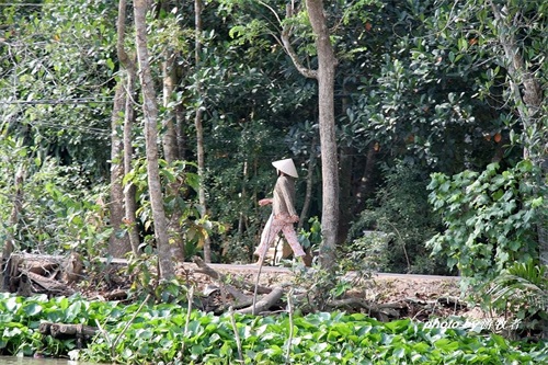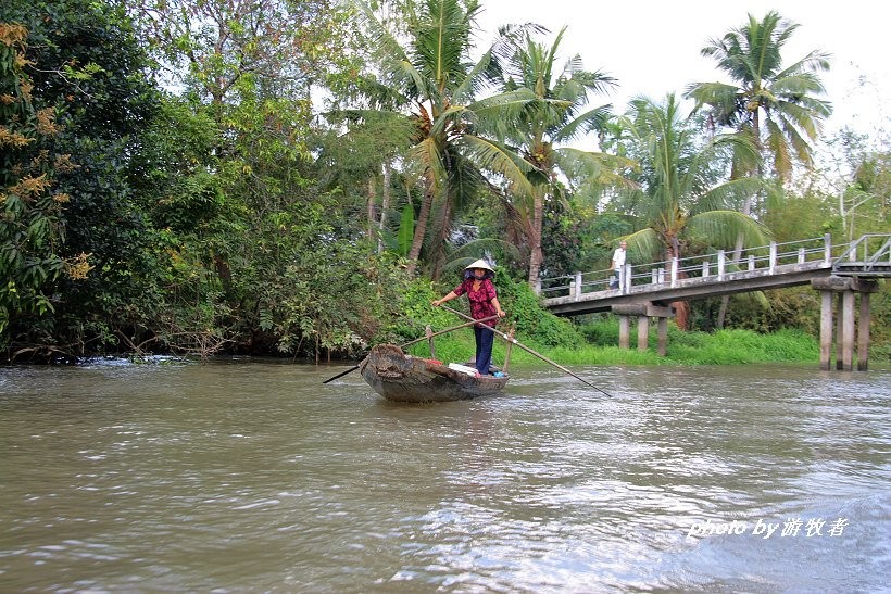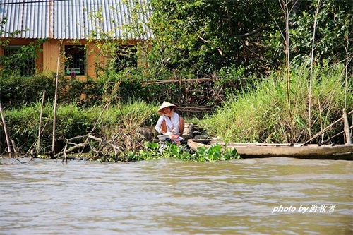 小河上不时会看到有戴着斗笠的越南女人,划着小船从我们的身体经过。在越南战争期间,越共就是利用湄公河三角洲茂密的丛林作为掩护,开展游击战争,沉重打击了美国军队和南越军队。