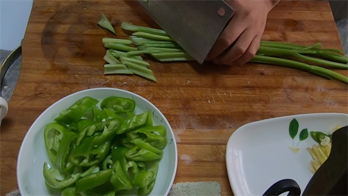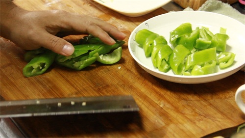 处理尖椒这活儿我真是驾轻就熟,就是一推一拉的事儿,这次用也不用劈开,直接下刀切成段,放盘儿里就行,