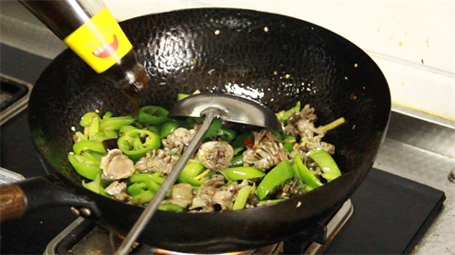 这时候再放蚝油,加点黄酒提个味儿,再来点生抽,拨拉个五六七八下,紧接着放适量盐、不要钱的胡椒,再加点鸡精还有白糖,