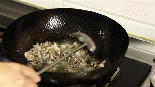起锅烧油,三成油温下入焯水的鸡胗,滑油十来秒就完事儿,