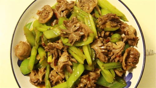 就倒入一旁久等的芹菜,双手要通力合作,快速翻炒,