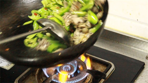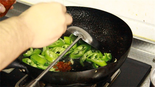 紧接着放入姜蒜还有线椒,快速炒香,同时开大火,放入尖椒段,