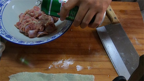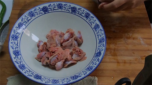 切好的鸡胗放到祖传的青花瓷碗中腌制下效果最好,当然了,你们家如果没有换别的碗也能有去腥的效果,