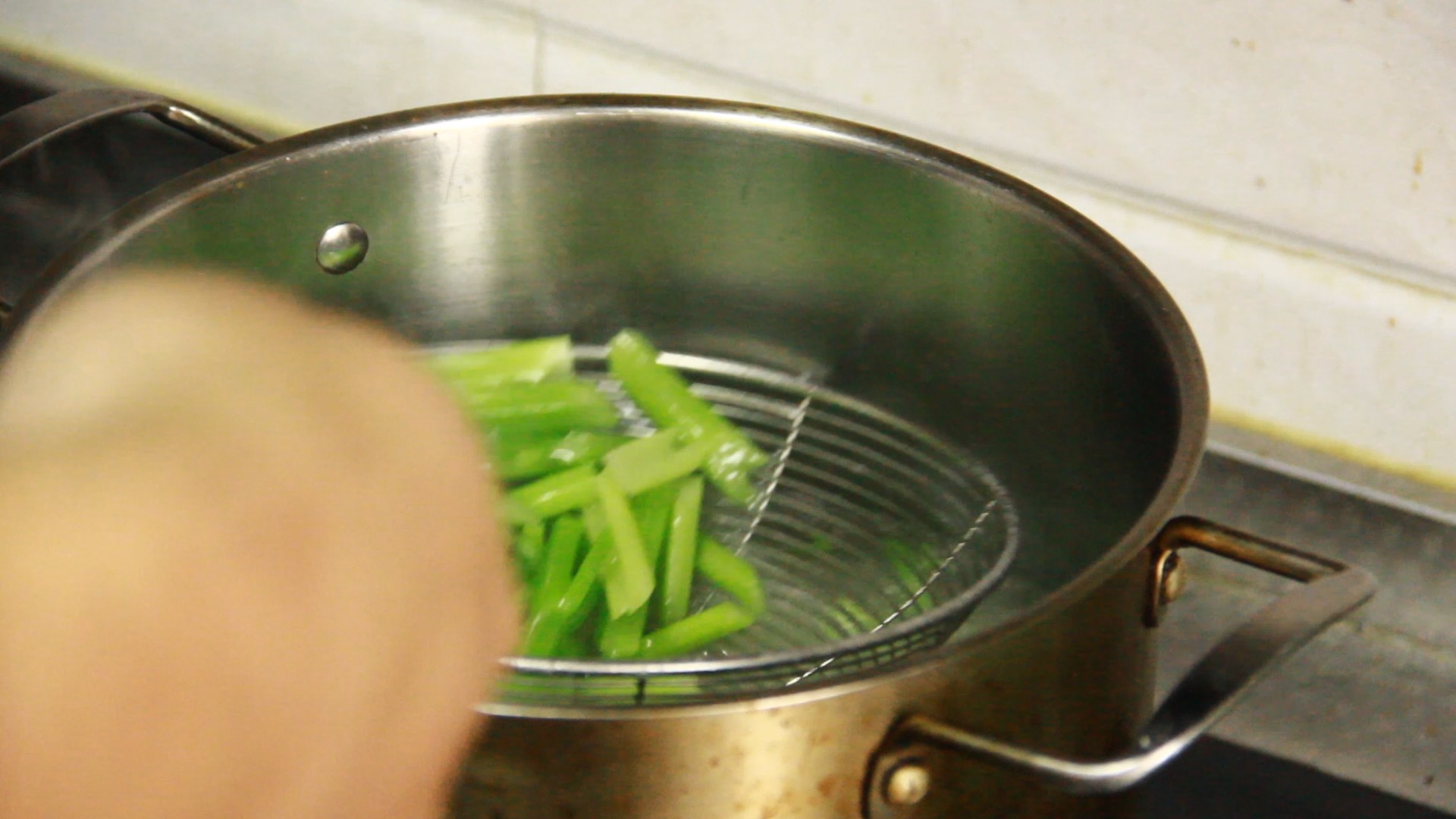 趁着水的热乎劲儿,紧接着放入芹菜段儿,这点热水资源要充分利用,把芹菜烫个二十来秒就行,