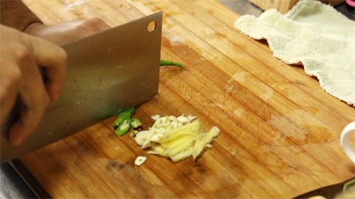 接着还得需要几片老姜,这次是把它切成丝儿,同时再找几个蒜瓣切成片儿,还有一根线椒切成段 ,