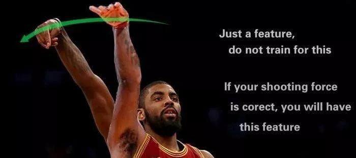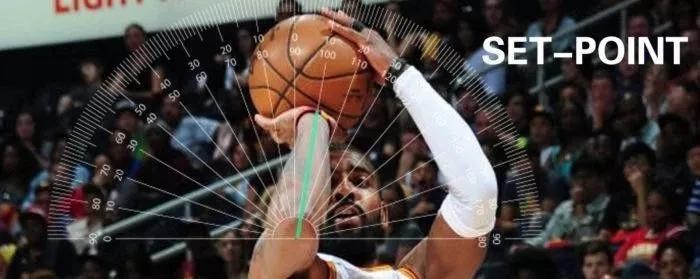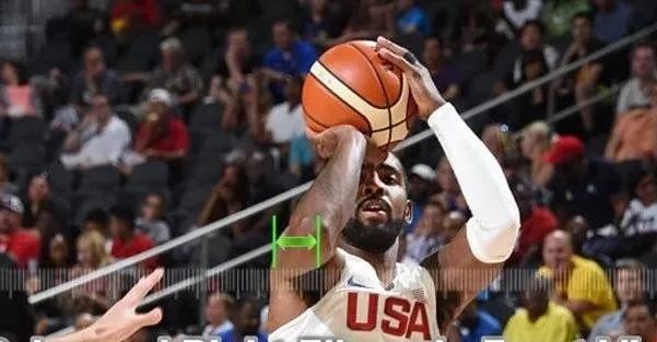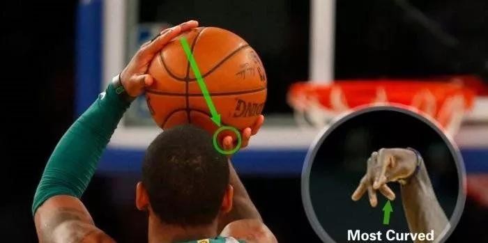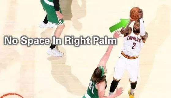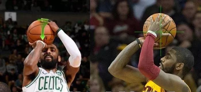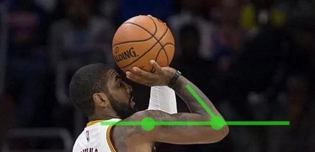 3.肘部动作:与标准投篮姿势不同,欧文投篮时肩膀与大臂为90°,大臂与小臂为45°,小臂与手腕为90°