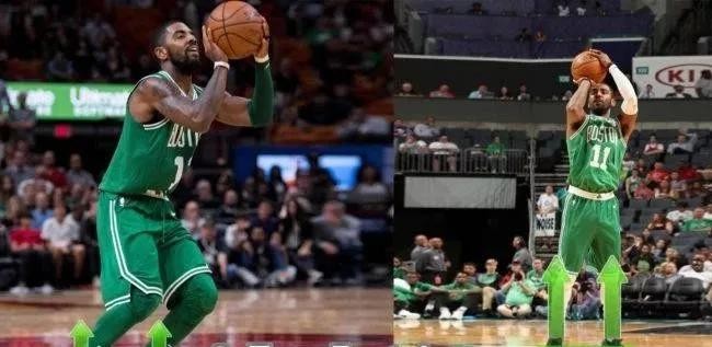 雷阿伦在每次接球前,都会先轻轻跳起再接球,落地的同时双脚平行,脚尖内收,再顺势下蹲起跳发力,可以让力量流畅的传导到手上出手,欧文也是如此。