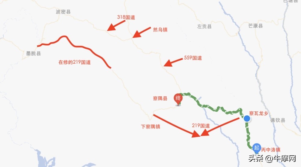 丙察察线,即云南丙中洛镇—西藏察瓦龙乡—察隅县城,原本是地图上没有的乡道,全长300公里左右,现已纳入新219国道。大概路线见下简图,丙中洛出发,快到察隅县走559国道到然乌,等到墨脱的新219段修好以后,就不用绕道318了。