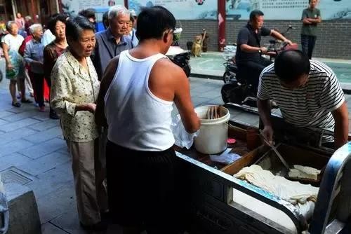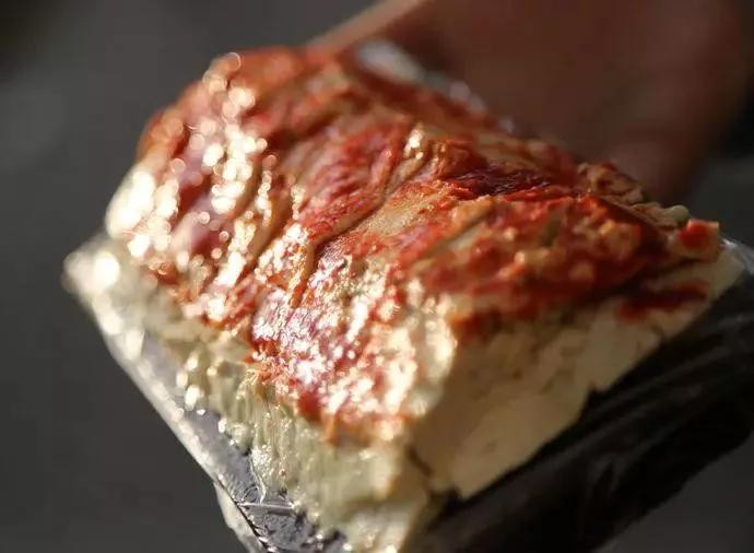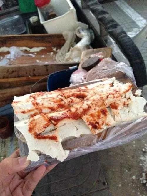 济宁热豆腐也叫托板热豆腐,顾名思义一年四季肯定是热的,略烫口舌的刚好。热豆腐做得细嫩,酷似块白玉,卖豆腐的师傅用铜制的豆腐刀子,将豆腐从大块上一片片地打到小木板上,再用刀划拉成麻将块大小的条块,再抿上特制的红红的辣椒酱,托板豆腐便做好了。这辣椒酱不算很辣,即使不吃辣椒的人也能耐受,所以才老少皆宜,人人爱吃。济宁市民都说宣阜巷有位老师傅卖的热豆腐最为好吃,一天卖两次,半小时卖完,需要排队买,我去过几次,都没买到,遗憾至极!