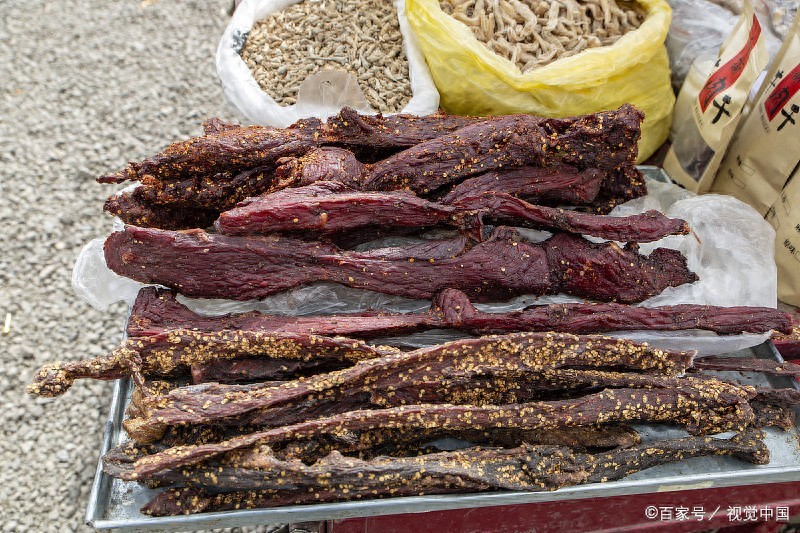 **风干牛肉**是呼和浩特最具代表性的美食特产之一。这种源于蒙古铁骑军粮的传统食品,以其肉质紧实、味道鲜美而闻名遐迩。呼和浩特的风干牛肉选用草原上放养的优质黄牛,经过精心挑选、切割,再挂在通风处自然风干。这样的制作工艺使得牛肉不仅保留了原始的醇厚口感,还增添了风干的独特香气,成为草原上的一道美味传奇。