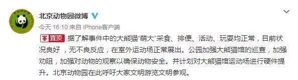 事件中的大熊猫“萌大”采食、排便、活动、玩耍均正常,目前状况良好、无不良反应,在室外运动场正常展出。公园计划对大熊猫馆运动场进行硬件提升。