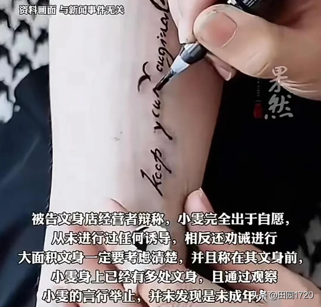 2023年5月,14岁少女小雯在朋友劝说下,带着对个性的憧憬,走进一家普通纹身店。当时的她满心期待着新造型,在双臂和手腕纹上心仪图案文字,整个过程只花了150元。谁能料到,这笔冲动消费掀起了大风浪。小雯母亲偶然发现女儿纹身,震惊愤怒之余,直接将纹身店店主告上法庭。