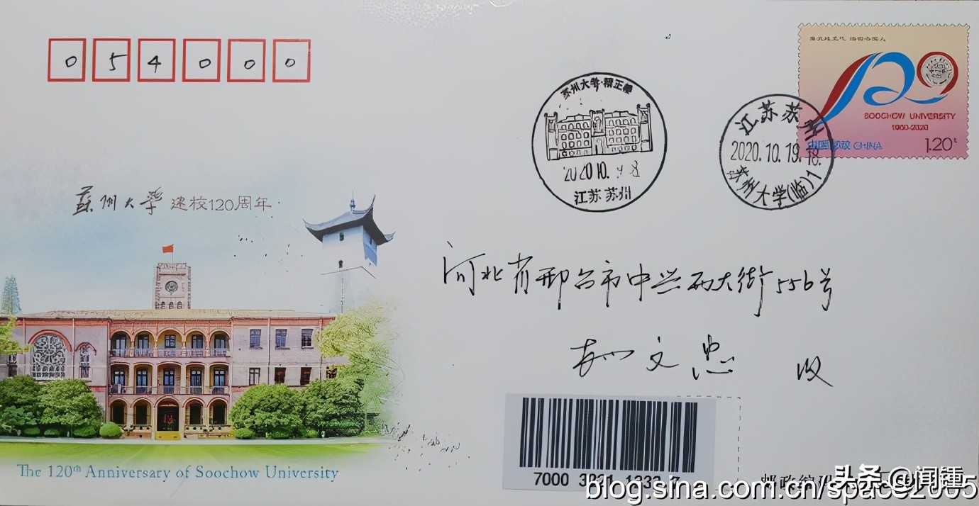 也许正是留有遗憾,才能为下一次的走进苏州找一个很好的借口。收到了苏州本家老师寄给我两枚苏州大学120周年的纪念封和邮资封,禁不住对这个学校产生了一丝好奇,与对岸的东吴大学同宗同源,共同走过了120个春秋,留下的桃李芬芳,集合了多所百年历史的学校,让新的苏州大学的历史更加厚重,也许这就是文化与岁月的沉淀。