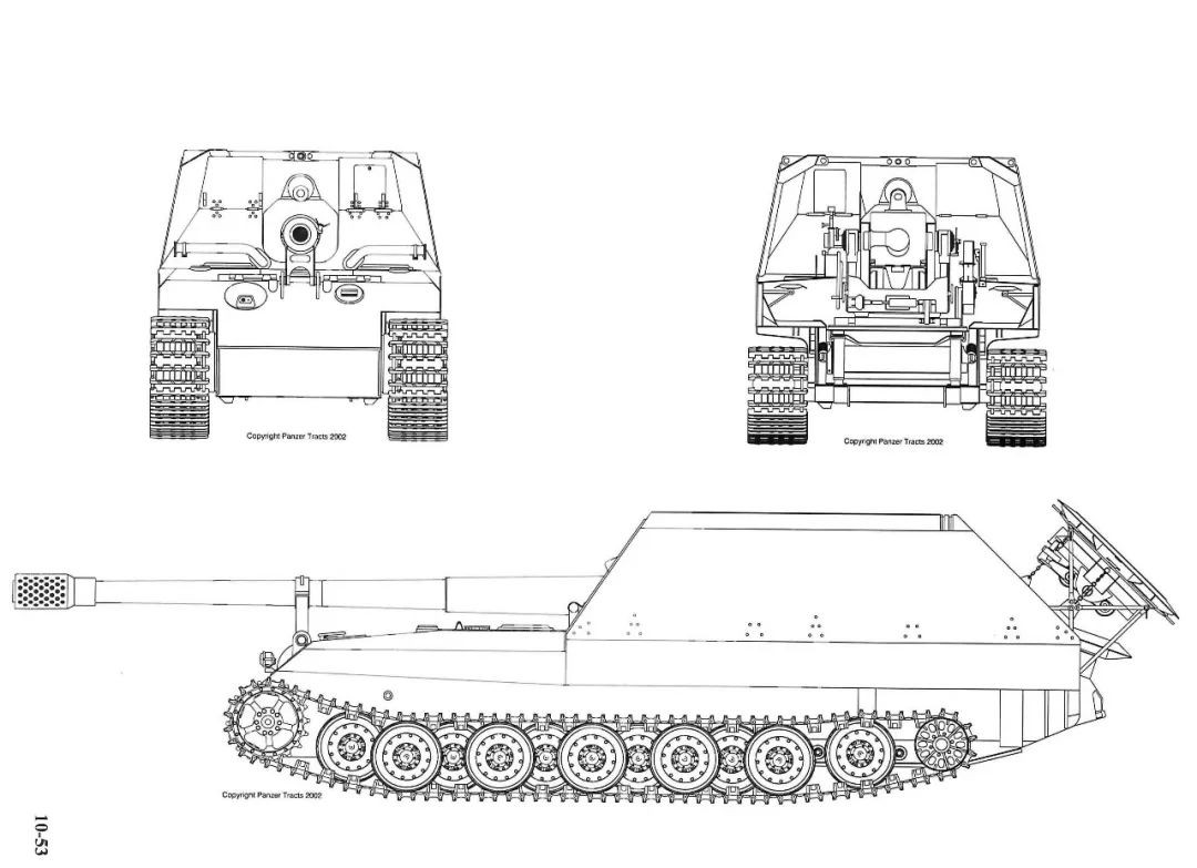 是的没错,虎式自行火炮的底盘并不是虎式,而是虎王的底盘加了2对负重轮。但是战车的装甲却被显著的削弱(原型车首上装甲只有50mm,而且还是软钢)了,这倒也无可厚非,毕竟自行火炮也不能当成坦克来用,它们比坦克贵得多而且更娇贵。