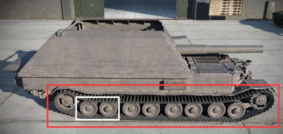 游戏里面所有的自行火炮,都是行军状态,在这个状态下它们的火炮驻锄都是收起来的,细心的车长老爷们也可以关注一下261工程、T92、M53/55它们车尾挂着的那个“大铲子”,它就是火炮制退驻锄。但是,虎式自行火炮这个独特的设计和它们不同,所以虎式自行火炮车尾顶着的这口“大黑锅”实际上只是那门火炮的旋转支座,不能简单地称作火炮制退驻锄,二者有明显差别。