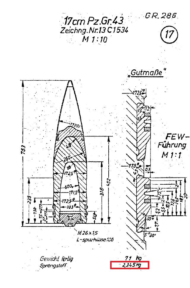 至于火炮的老本行“炸!”呢,170mm K18也毫不含糊,该炮配发使用两种高爆弹,一种是标准的Gr 39高爆弹,弹头重68公斤,最大射程是28公里。另一种是增大射程的远程高爆弹Gr 38,弹头重62公斤,换装了更好的风帽,最大射程提高到29.6公里。