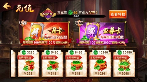 魂玉在游戏中的价值最高,玩家获得魂玉的途径少之又少,其中充值就成了最常用的一种获取方式。《无双赵子龙》总共为玩家提供了两种充值方式,一种是购买福利卡,另一种则是直接充值。福利卡又分为两种,分别是价值30元的月卡,购买后立即赠送给玩家300魂玉,并在之后的30天内每日颗领取100魂玉和100万银两。另一种是至尊卡,购买成功后立即获赠600魂玉,并且每天可领取100魂玉和200万银两,总共持续90天。选择直接充值购买魂玉的话,人民币与魂玉之间的兑换比率为1:10,玩家可以选择从6元到2048元不等的充值数额,而且首次购买赠送双倍魂玉,相当划算。