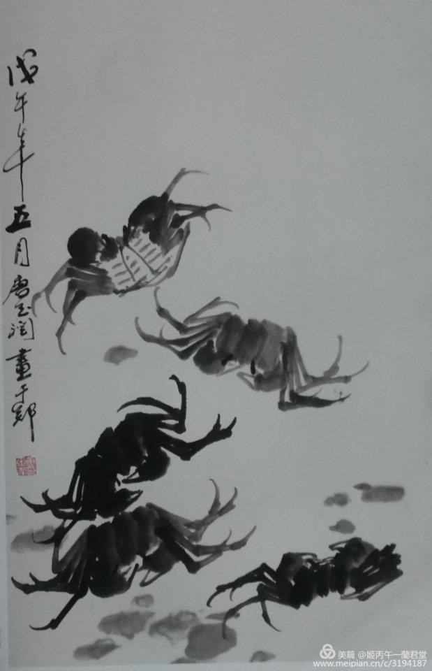 到了那天,老板让派车接了唐老师,老板找了个录像师全盘录了像。作画是在老板的家中,他是怕公司太热闹,影响老师做画。唐老师那天画了二张四尺牡丹横幅,二张行草书法。老板有拿一本大册页,悄悄对我说:“让唐老师在上面画一张吧。"我想都没想拿过去:“请老师在这上面再画一张吧,"唐老师看了一眼,爽快把已经收好的笔拿出来,在册页上画了几只很传神的虾。那天老板盛情要款待唐老师,老师婉言推辞后,有我亲送老师回到了家。我很感恩唐老师对我的厚爱,后来因各方朋友托我求老师的画,我能推了尽量推,实在推不了,就硬着头皮去找他,他从来沒有因付的润格低而不悦。