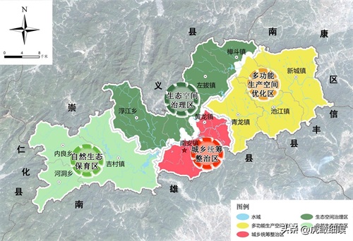 保护与管控:两屏三区。两屏:东北部山区生态屏障、西南部山区生态屏障;三区:林果茶菌农旅产业复合示范区、省级现代农业示范区、精品农业畜牧养殖业示范区。