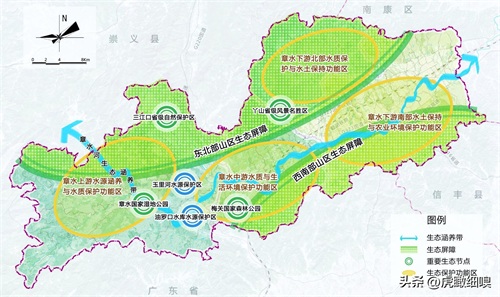四区:章水上游水源涵养与水质保护功能区、章水中游水质与生活环境保护功能区、章水下游北部水质保护与水土保持功能区、章水下游南部水土保持与农业环境保护功能区。