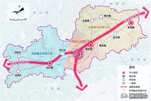 提升与发展:一核一圈两轴多点。一核:中心城区综合服务核心;一圈:中心城区拓展辐射圈;两轴:西部融合发展轴、东部提升发展轴;多点:三个重点镇、三个特色镇和四个一般镇。
