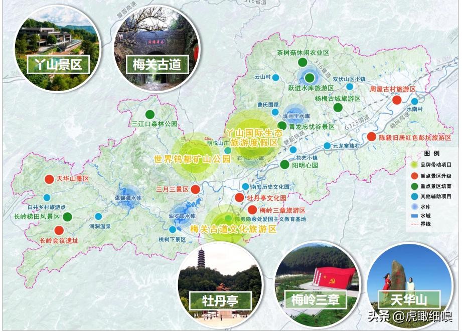 7 个重点升级:周屋古村旅游区、牡丹亭文化园、天华山景区、梅岭三章旅游区、长岭会议纪念园、三月三景区、陈毅旧居红色彭坑旅游区。空间扩容、创意植入、综合升级优先增补龙头/引擎项目。