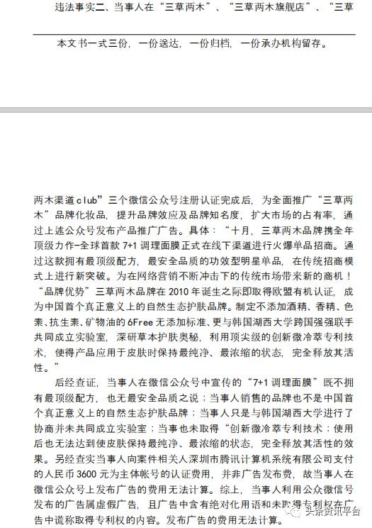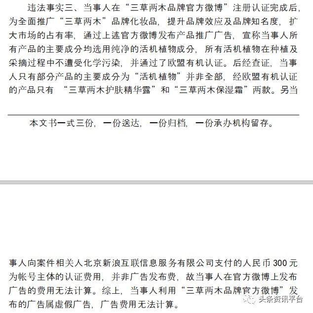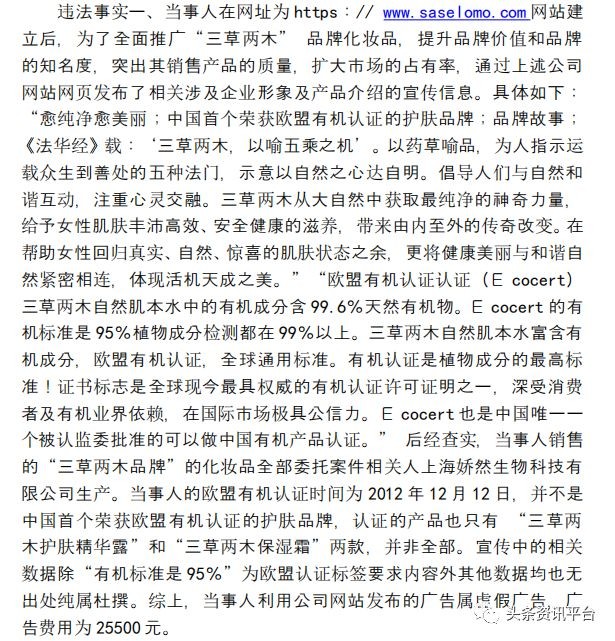 据该行政处罚决定书披露,上海传美化妆品有限公司作为当时的三草两木商标的持有人,曾有以下几项违法事实:其一,三草两木方面宣称其产品为中国首个荣获欧盟有机认证的护肤品牌,此为虚假广告,而且认证的产品也只有“三草两木护肤精华露”和“三草两木保湿霜”两款,并非全部。