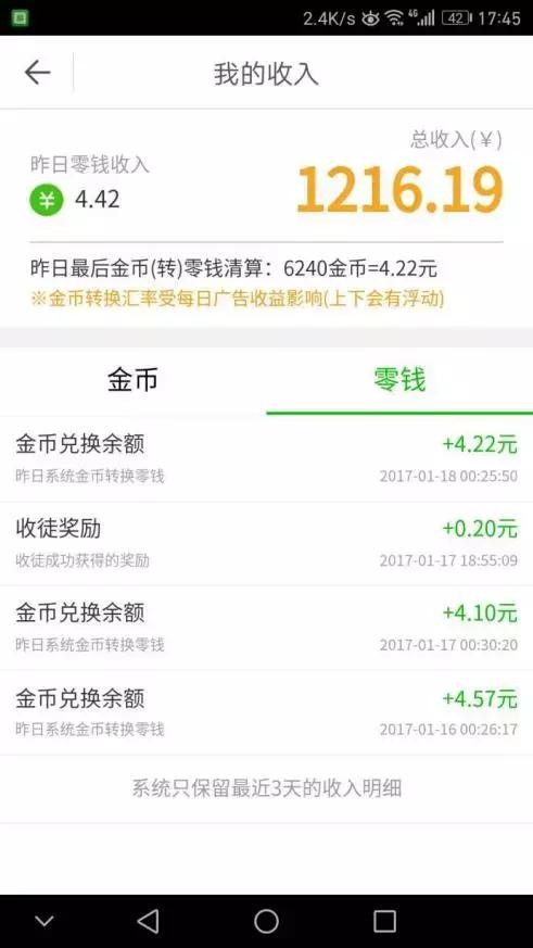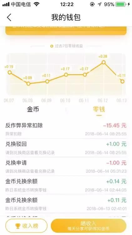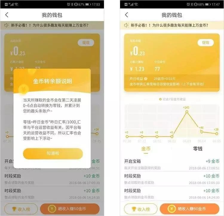令人心动的是,在这里获得的所有金币,都可换成现金,通过微信、支付宝提现。目前来看,以当日转换汇率为准,大约1000到1500金币可换算成1元。趣头条官方称,金币转换汇率波动受每日运营收益影响。从这点上看,代表着趣头条掌握了议价权,使得补贴金额与营收金额可以一直维持在一定的比例。