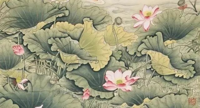荷叶罗裙一色裁,芙蓉向脸两边开。