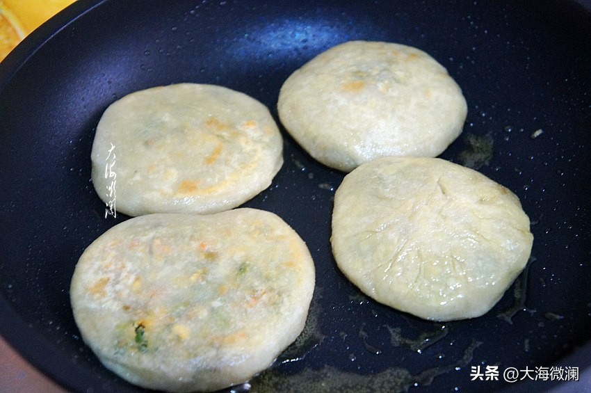 平底锅加入适量的菜籽油,下入包好的馅饼,小火两面烙熟。出锅,皮薄馅大,这馅饼老香了。