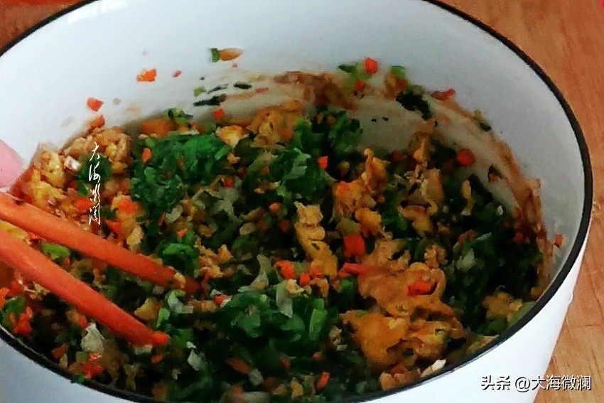 小白菜洗净焯水,捞出过冷水后攥掉水分,切碎。胡萝卜去皮洗净,切碎,鸡蛋打散,少许兑点料酒去腥,起油锅煎熟,大葱去皮洗净,切碎,将所有食材放入盆中,加入盐、蘑菇粉,胡椒粉、生抽、蚝油拌匀。