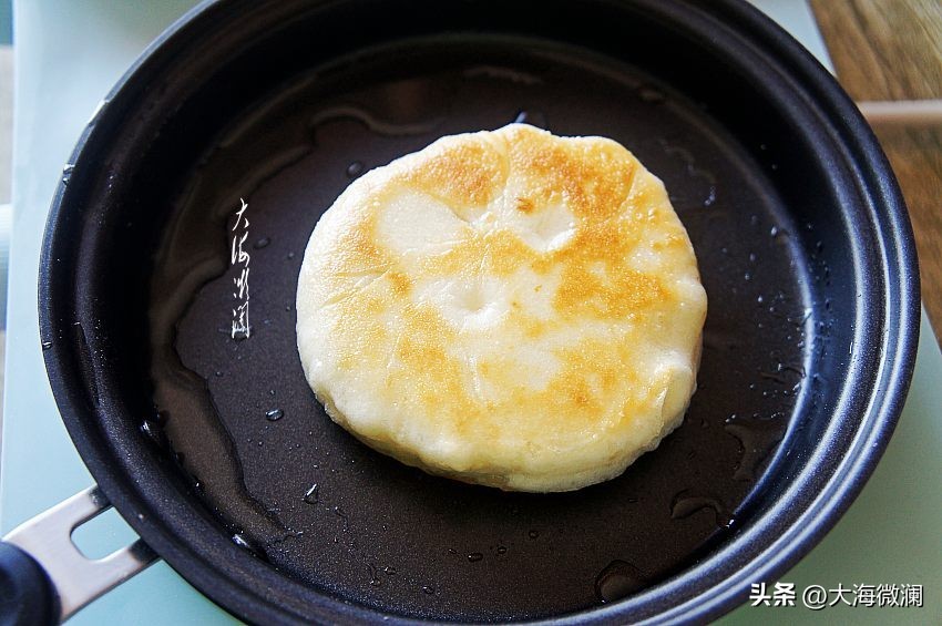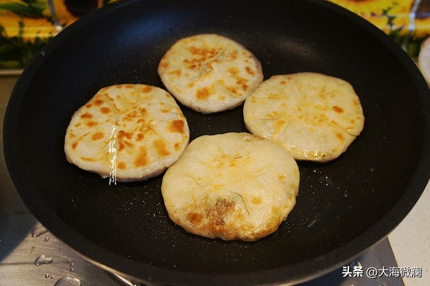 平底锅刷底油,码入包好的馅饼,小火两面烙熟。出锅,皮薄馅大,柔软又劲道。