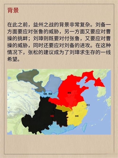 在这个背景下,益州之战的导火索主要是曹魏对蜀汉的威胁感,以及刘备希望扩张势力、巩固政权的需求。双方在战略上都希望通过控制益州来增强自己的军事和经济基础,从而为后续的争霸奠定基础。