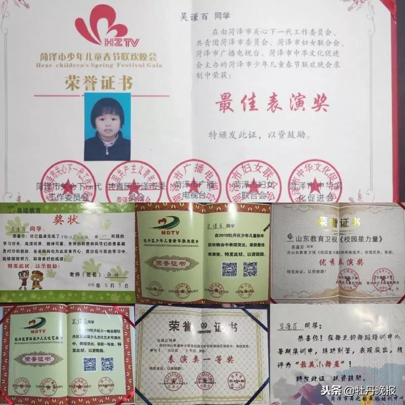 马文静向牡丹晚报全媒体记者展示了吴谨百的证书——山东省“校园才艺大赛”菏泽赛区声乐组一等奖;山东教育卫视“校园星力量”最佳表演奖;2018年“菏泽市少儿春晚”最佳表演奖;2018年度舞之韵“最美小舞星”称号;2018年“牡丹区第四届校园文化艺术节”优秀小演员;第七届“齐鲁情”专业赛幼儿组优秀表演奖等。
