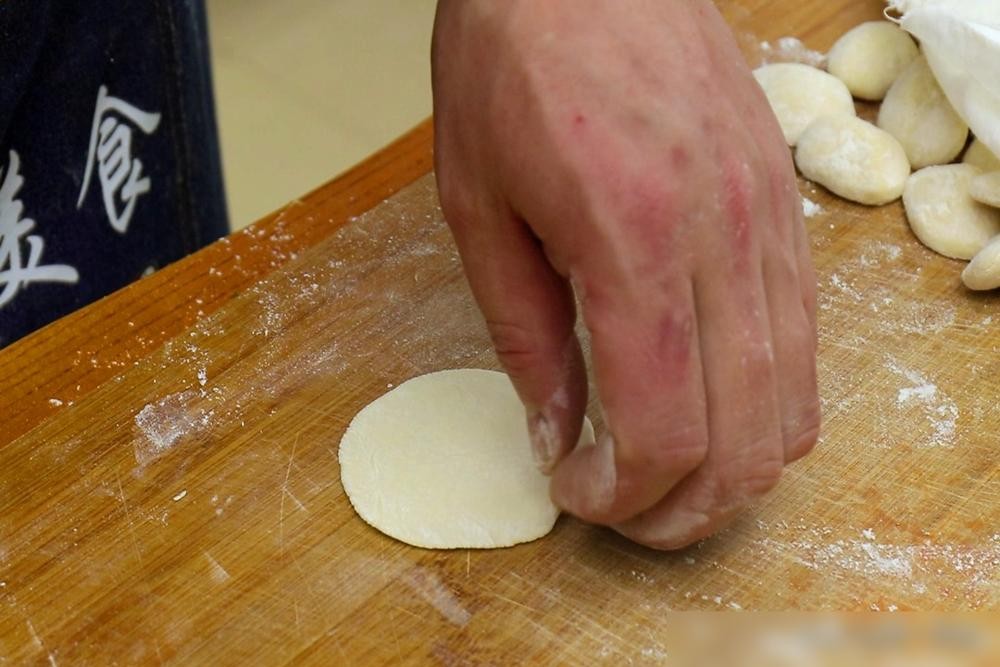 tips:擀饺子皮时要让皮在擀杖下自由的转动哦~