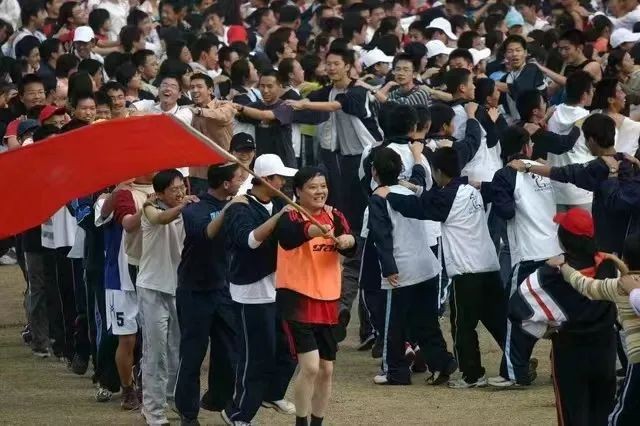我有一张在杭州二中时的照片,一直存着。那是一次全校运动会,结束时全体学生接龙跳兔子舞,一开始很多老师都站在外圈看。后来,老师们看我带头在队伍里,还跟着学生们一起喊“left,right,go,go,go”,也都放下矜持,纷纷加入。你看这照片里,站在队伍第一个举着旗的就是我。在这样的氛围下,杭州二中日渐形成一种新型的师生关系:师生共融,教学相长,彼此惜缘。让创造、自主和努力成为常识。