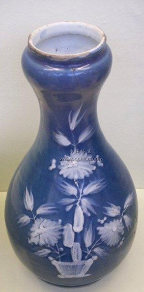 34、菊瓣瓶:瓶式之一,造型为撇口,长颈,溜肩,敛腹,圈足,下腹部浮雕一周菊花瓣为饰。为清代康熙朝独特器形之一。