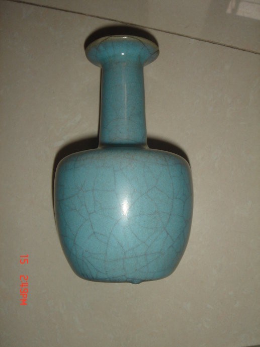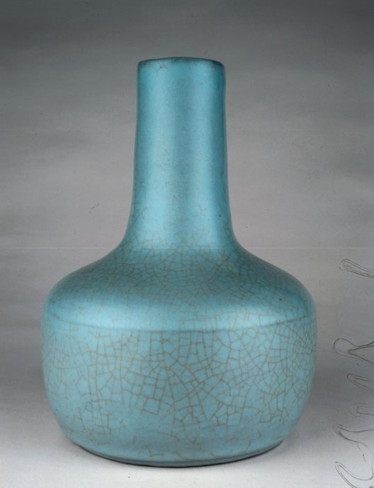 33、纸槌瓶:瓶式之一,因形似纸槌而得名。多见于清康熙。造型为小口,细长颈,丰肩,圆腹。宋代汝窑中较多。