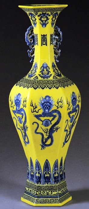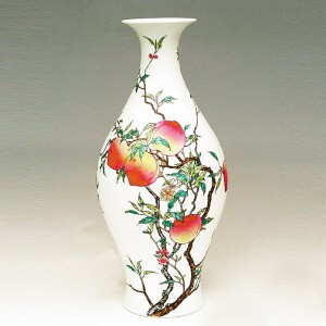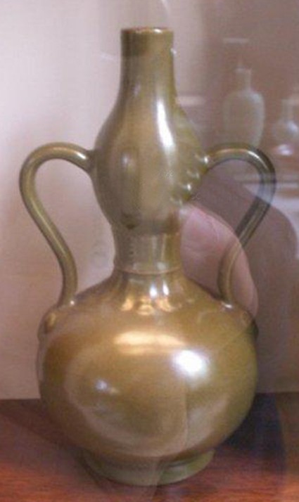 3、葫芦瓶: 形似葫芦的瓶式。自唐以来,因其谐音“福禄”,为民间所喜爱,遂成为传统器形。及至明代嘉靖时,因皇帝好黄老之道,此器尤为盛行并多有变化;除传统器形外,又有上圆下方式,蕴含天圆地方之意。至清康熙时,成为外销瓷品种之一,器形比明代的高大,并出现三节或四节式葫芦瓶。雍正以后,创制一孔葫芦瓶,嗣后变化多端,其中器口内敛,卧足,饰对称如意绶带耳者又演化为“如意尊”。