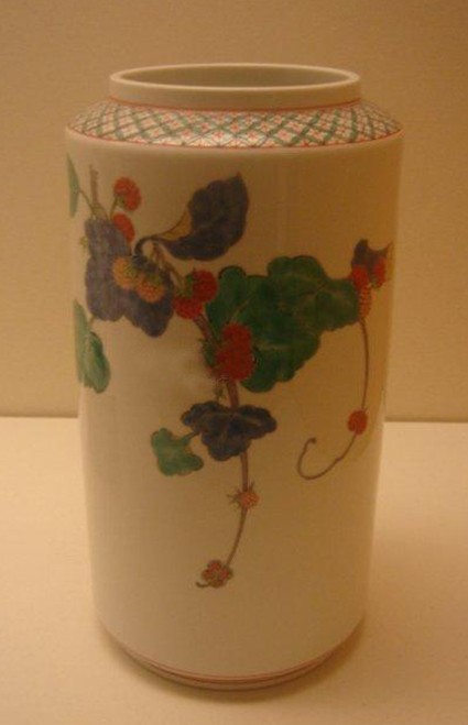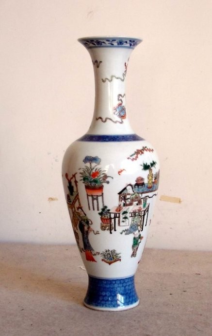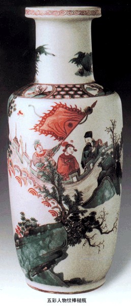 27、筒瓶:瓶式之一。造型为侈口,短颈,溜肩,长腹,平底,形若直筒,故名。筒瓶始见于明代万历朝,在清初顺治、康熙两朝被赋予“大清天下一统”的寓意,从而成为民窑中最为流行的器物。