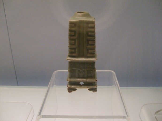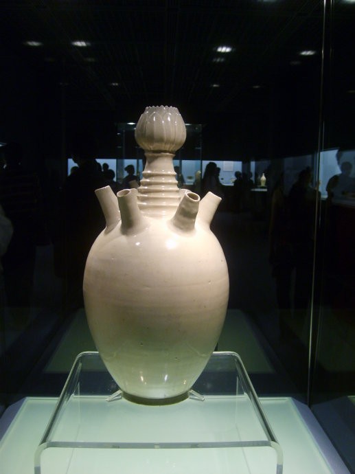 11、多管瓶:又称牛角罐,冥器。流行于宋的一种瓶(罐)式,因瓶肩部各面分布着直立的多棱形或圆形管而的名。瓶直口,上有花纽盖,瓶身有圆管式和多级塔式,有五管、六管之分,管中空,多与瓶不通。龙泉窑烧制数量较大,磁州窑也有烧制。北方磁州窑制品,瓶体较肥硕,肩部直立的六管短而粗。冥器多怪异。