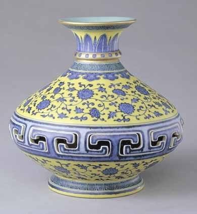 40、交泰瓶:清代流行的一种瓶式。器腹中段镂雕成如意头形,套钩回纹或倒、正“T”形。瓶体上下于纹饰间相互钩套、连为一体,可以活动却不能分开,寓意“天地交泰”,为清代乾隆早期御窑厂督陶官唐英和催总老格刻意制作专供乾隆皇帝玩赏的佳器。
