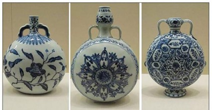 22、扁腹绶带葫芦瓶:一种瓶式。器形似扁葫芦,颈部有对称双系,因腹圆若满月,又称“抱月瓶”或“宝月瓶”,陶瓷花瓶为受西亚文化影响出现的器形。此式瓶始见于明代洪武御窑器,盛行于永乐、宣布德两朝,此后至明末不复出现。清代康熙、雍正、乾隆三朝官窑有仿制品或略加变化,改称“马挂瓶”,为皇亲国戚骑马出行时随身携带的用具。