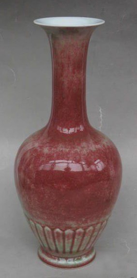 38、藏草瓶:又称甘露瓶,瓶式之一,清朝廷为西藏僧侣烧制用于插草供佛的特别器皿,故称藏草瓶。雍正时已有烧制,乾隆时期制品为圆唇口,直颈有凸弦纹,丰肩,腹下部渐收,束胫,足部外撇。这类瓶式不书款识,一般多认作乾隆制品。