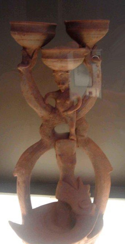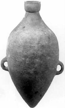 1、尖底瓶:新石器时代陶器,仰韶文化半坡类型最具代表性的器物之一,汲水器,红陶质,手工制作。器形为小直口、细颈、长圆腹、尖底、肩部或腹部有对称的双系用以穿绳,器表有多绳纹,烧结程度较好,质地坚实。汲水时由于重力作用,瓶口会自然向下,待水将满时,瓶身自动倒转,口部向上。仰韶文化庙底沟类型及马家窑文化遗存中发现的尖底瓶略有不同。庙底沟类型的尖底瓶为双唇、小口,器身瘦长,肩腹部无系。马家窑文化的尖低瓶为侈口、直颈、折肩、腹有双系以细泥橙黄陶制成,器表涂浅红色陶衣,以黑彩绘旋纹,纹饰充满动感,制作精细。