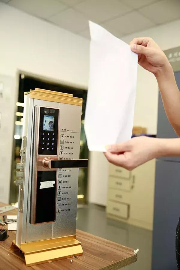 最后,用A4纸打印的黑白照片,贴近智能锁上的人脸识别探头。